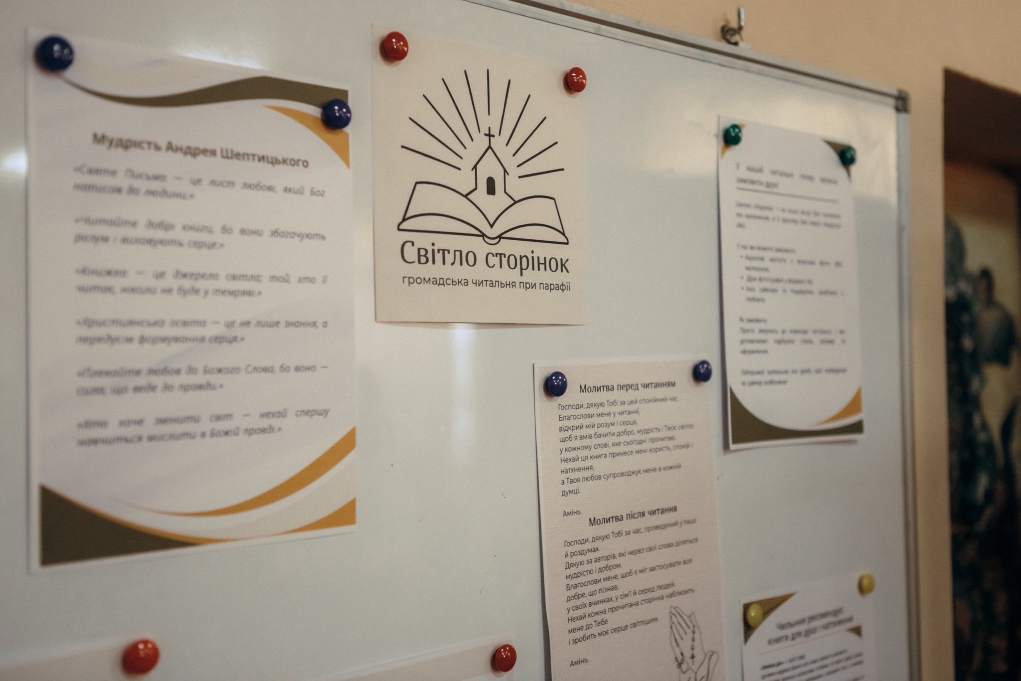 Читальня «Світло сторінок» покликана стати місцем, де кожен може читати, надихатися, спілкуватися та духовно зростати. Вона була створена за підтримки Української освітньої платформи та завдяки добродіям і громадам із різних міст України — Львова, Івано-Франківська, Києва, Тернополя, Рівного та Кривого Рогу — які долучилися до її відкриття.